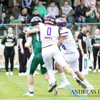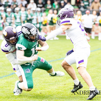 Als Defense-End steht #0 Max Grünsteidl am linken Ende der DLine und geht immer wieder auf QB-Jagd bzw. auf den Ballträger.
